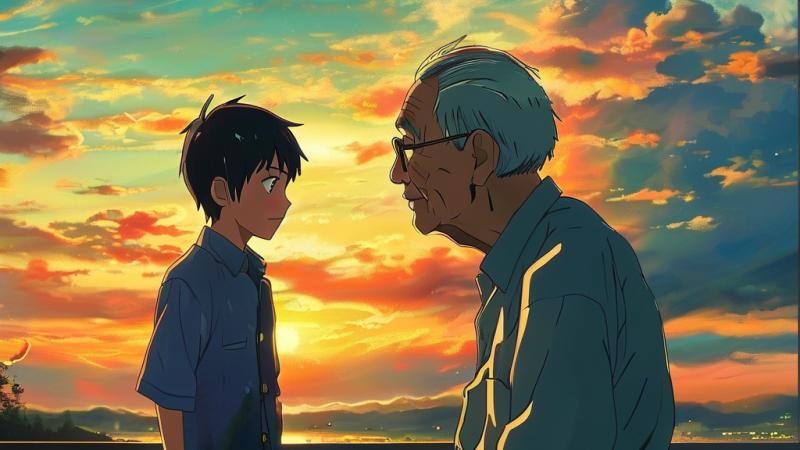 他忽然指着江面说:“你看,太阳要回家了。”我顺着他颤抖的手指望去,一轮巨大的落日正缓缓下沉,把江水烧成一条流动的金带。爷爷喃喃道:“我像你这么大的时候,也在这江边跑,觉得日子长得望不到头。现在啊,觉得一天就像眨一下眼。”他的声音混着风声,有些模糊,却重重地落在我心上。那一刻我忽然明白,生命是一场温柔的目送,我们奔跑向前时,总有人在原地站成温暖的坐标。